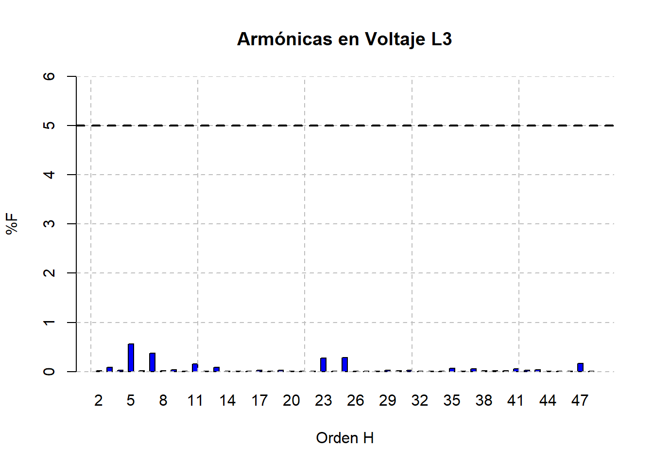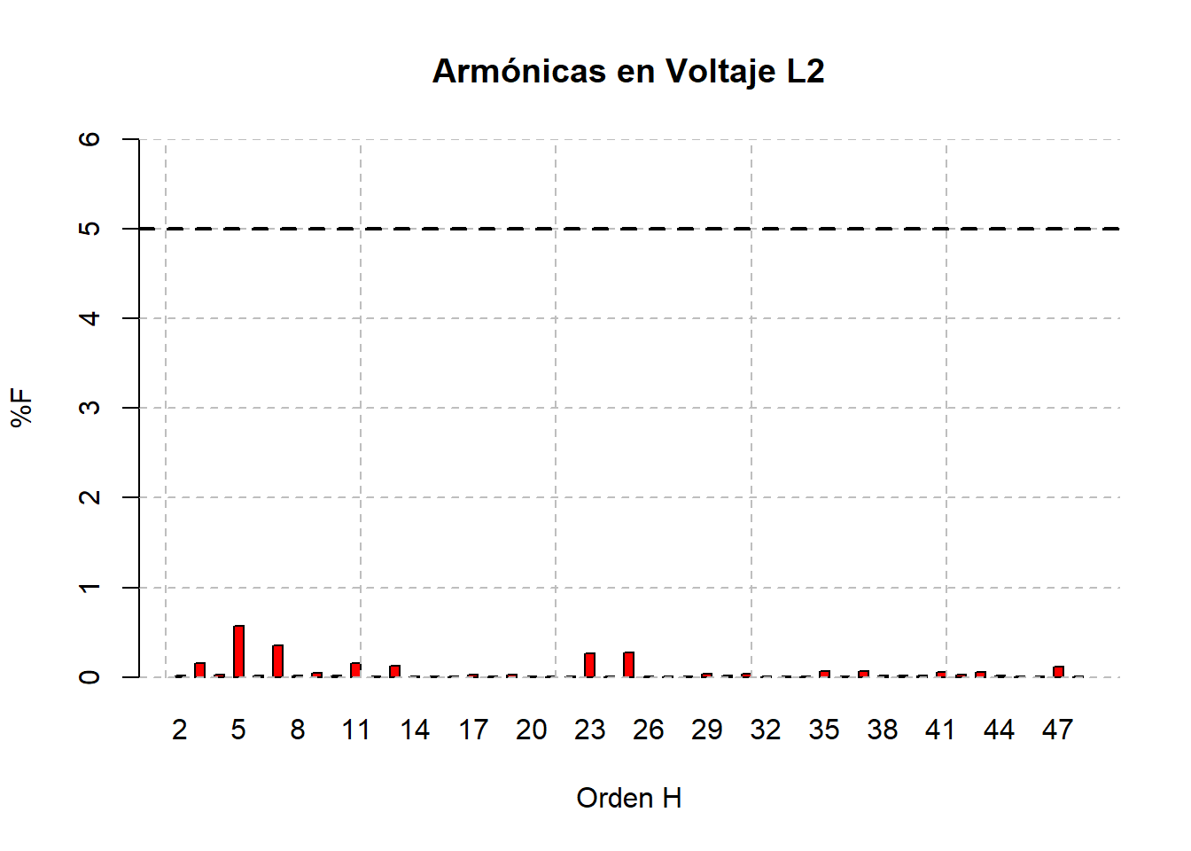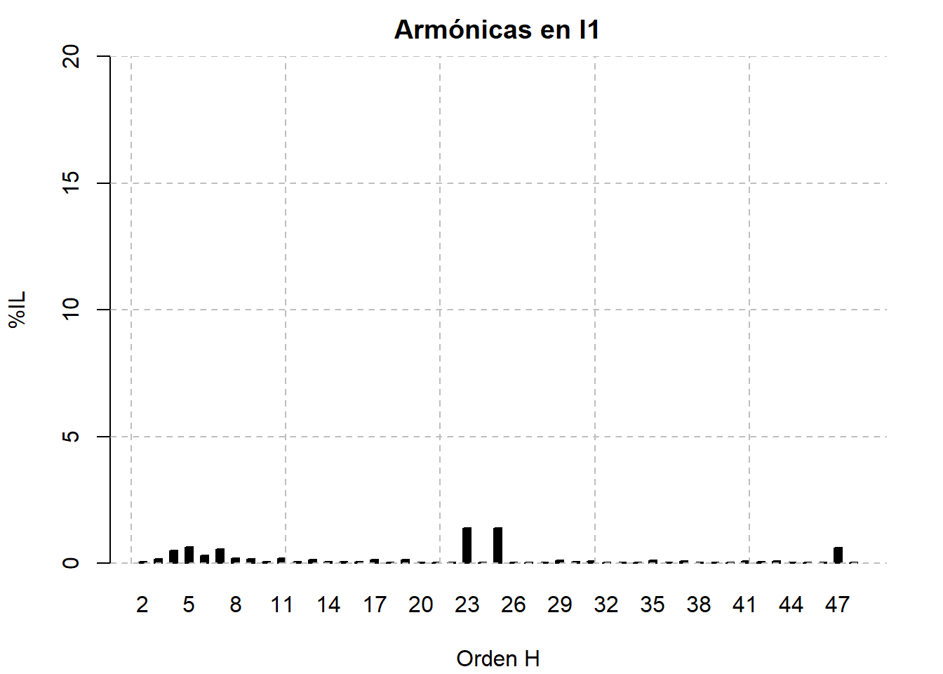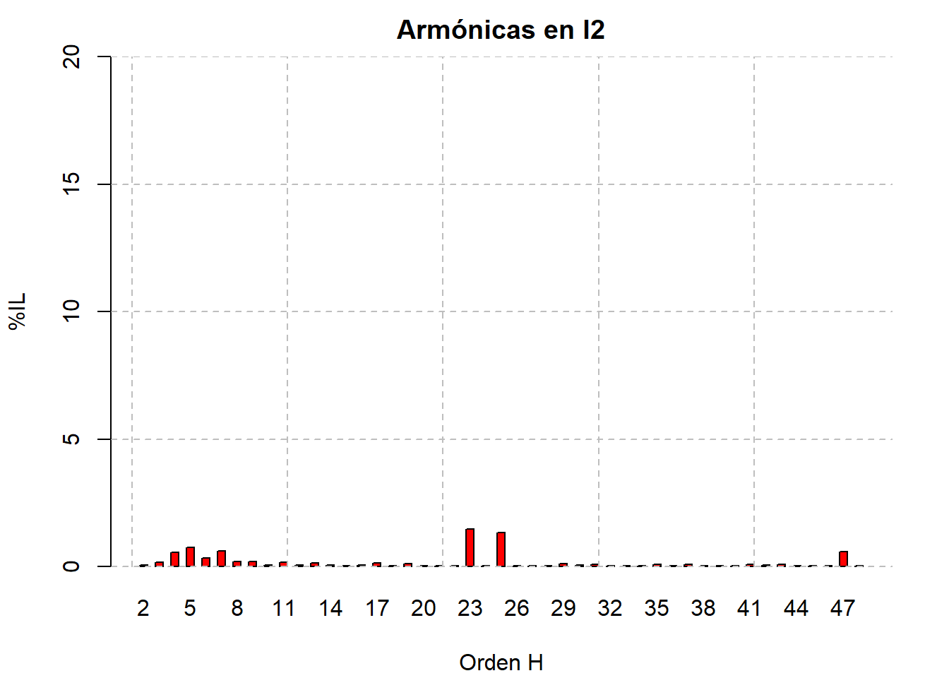 El comportamiento de las armónicas de corriente sigue el mismo patrón que el mes anterior, siendo las armónicas de mayor magnitud la 23ª, 25ª y 47ª, inclusive mayores a las armónicas típicas como la 5ª y 7ª.